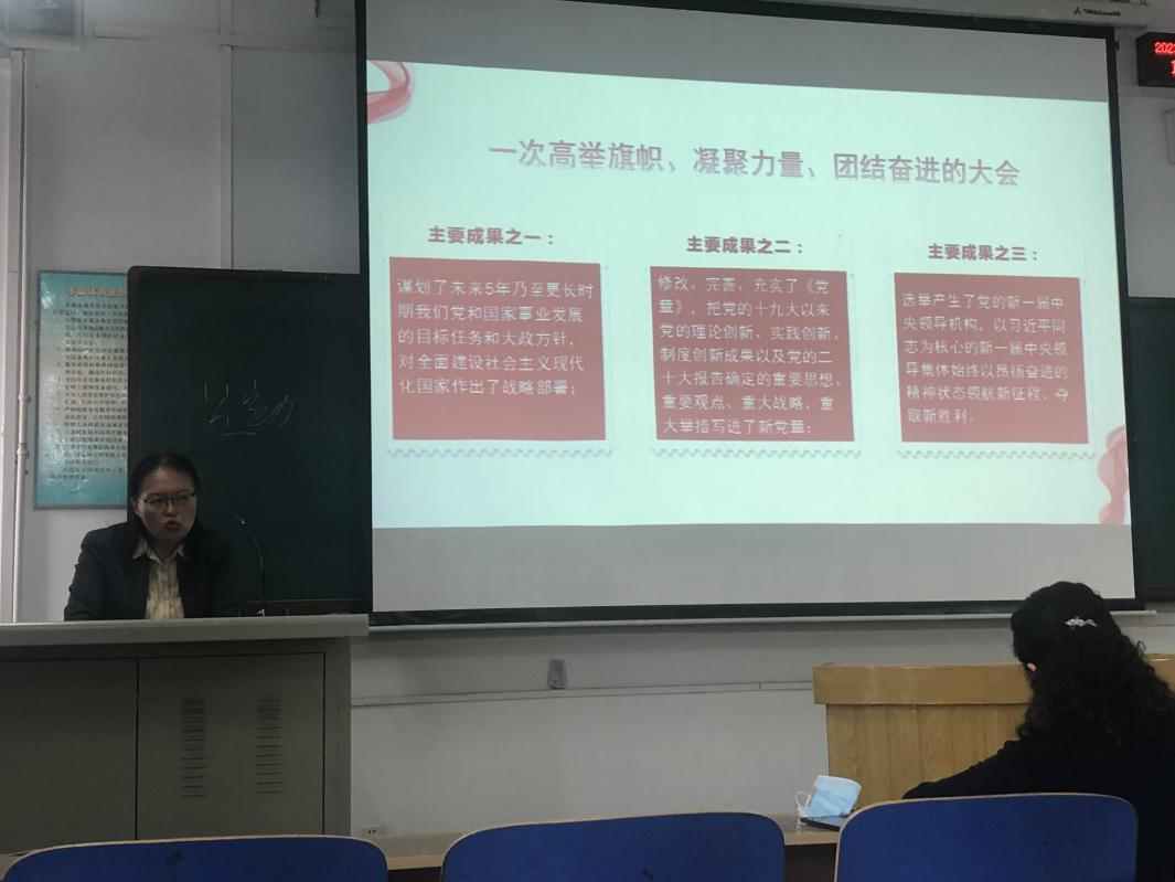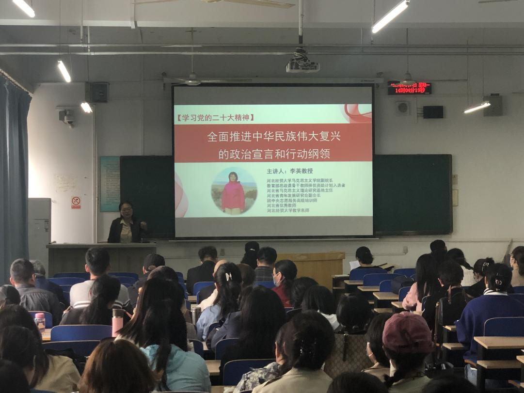 2023年4月17日, 太阳集团tyc539macau邀请马克思主义公司副经理李英教授进行党的二十大精神宣讲,讲座题目是:全面推进中华民族伟大复兴的政治宣言和行动纲领。讲座由太阳集团tyc539macau副经理杨清珍主持,太阳集团tyc539macau和外语部的全体教职工参加了讲座。