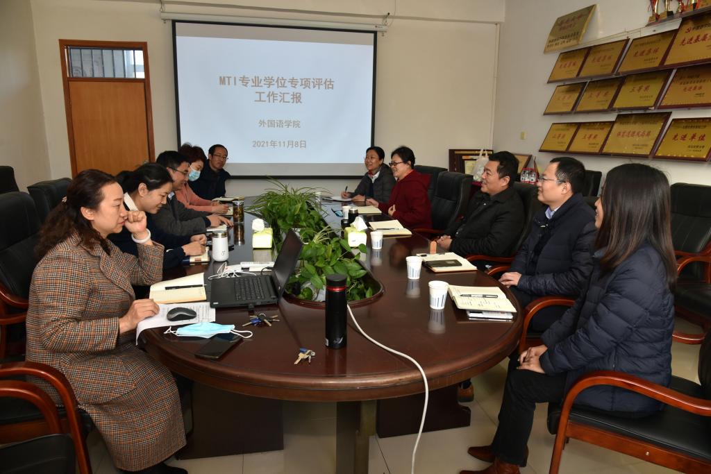 刘东英首先强调新增专业硕士学位点建设评估准备工作的重要性,介绍了公司对迎接评估的总体安排。杨清珍代表公司就翻译硕士专业学位点的建设与专项评估筹备工作做了比较全面的汇报。她对标学位点专项评估指标体系,就学位点的现状、学位点的建设情况、评估工作进程和评估工作中存在的困难、问题与工作思路一一作了讲解,并详细解答调研组的相关问题。