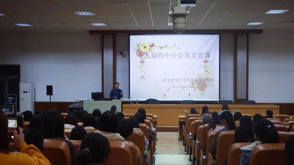 公司经理商利伟在C教201专门面向英语专业员工举办英文版十九届四中全会精神宣讲会,247名员工参加。商利伟用纯英文进行讲解,并针对其中专业用语做详细解释,帮助同学们在学习全会精神的同时,提升英语准确表达能力,达到学以致用的目的。