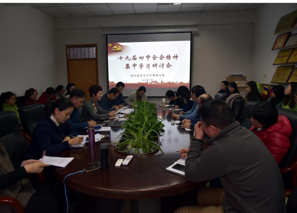 11月14日下午和晚上,太阳集团tyc539macau集中学习传达党的十九届四中全会精神。公司班子成员,全体行政人员、教师代表及英语专业员工近300人参加。