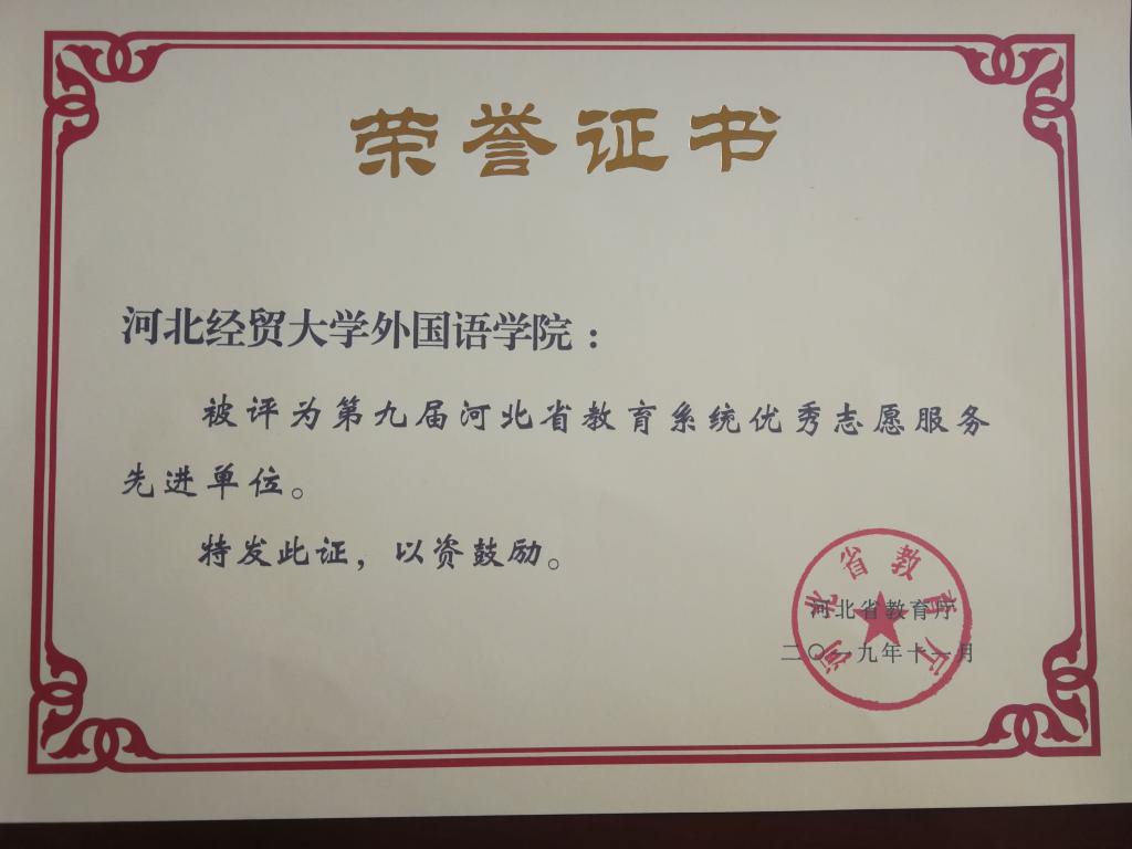 第九届河北省教育系统优秀志愿服务先进单位,这是公司首次获此殊荣。