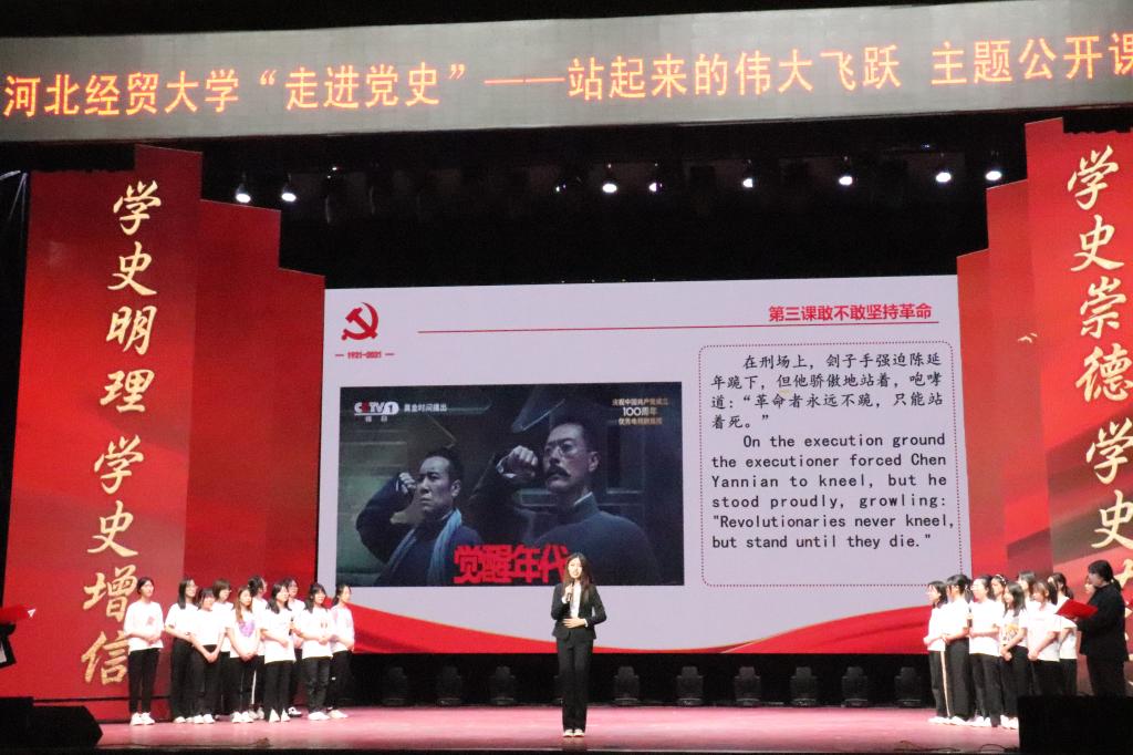 本次主题公开课充分发挥外语专业优势,通过中英双语为同学们生动的讲述党史故事。十个章节的讲解采用反转课堂的形式,将课程任务分配给一、二年级十个英语专业班级,各班员工群策群力,集体备课,搜集党史资料,全程全员参与讲述党的历史,课程讲解过程中穿插同学们精心剪辑的视频、热情饱满的歌曲、经典影视配音、情景剧、诗朗诵等形式,将中国共产党由弱到强,为争取民族独立、人民解放而不懈拼搏奋斗的精神和勇气展现在全体师生面前,具有很强的代入感,最大程度产生心灵共鸣。