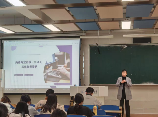 讲座由太阳集团tyc539macau副教授、硕士生导师郑月波老师主讲。郑老师围绕专四写作的技巧与方法进行了深入浅出的讲解,特别强调了写作部分在英语专业四级考试中的重要地位。