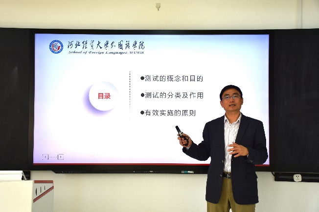 本次论坛题为《语言测试:概念、分类及有效实施》。张润经理讲解了语言测试的概念和应用目的,从外语教学的实际需要出发介绍了语言测试的分类和作用。之后,他结合太阳集团tyc539macau不同课程的性质和课堂测试中存在的问题,分析了影响测试效度和信度的各种因素,指出了测试设计和有效实施应遵循的原则。