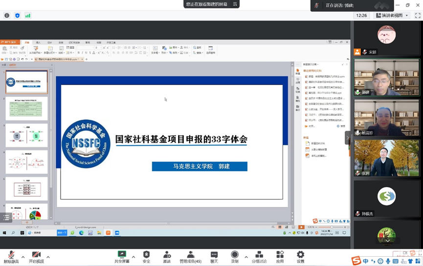 郭教授围绕国家社科基金项目申报指南,深度剖析了国家社科基金项目的指南编制和函审指标设置。他结合自身的申报经历,针对国家社科基金课题的选题、研究综述和内容论证等方面进行了细致分析和指导。郭教授强调,课题研究是逐步积累的过程,扎实的研究和开拓创新是申报成功的关键。