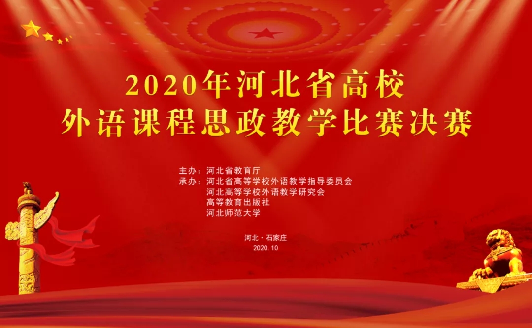 10月24日-25日 “2020年河北省高校外语课程思政教学比赛决赛”在河北师范大学举行,本次比赛由河北省教育厅主办,河北省高等公司外语教学指导委员会、河北省高等公司外语教学研究会、高等教育出版社和河北师范大学共同承办。