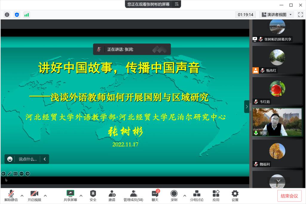 1117日下午,外语教学部举办了“双百论坛”,本部教师张树彬教授应邀作了题为“讲好中国故事,传播中国声音——浅谈外语教师如何开展国别与区域研究”的学术分享,活动采取线上形式进行,外语教学部主任张润主持,教学部60余位老师参加。